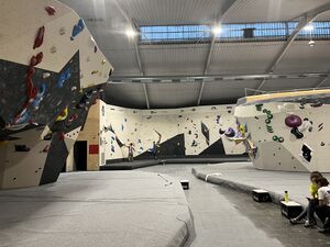 Cal Mico is mainly known for bouldering. Bouldering means climbing on walls without ropes. If you fall, you land on a crash mat. The routes are rated from 1 to 8, with 1 being the easiest and 8 being the hardest. The bouldering areas have Flipp crash pad flooring.[1] However, the bouldering walls are still quite high (around five metres), and incorrect landings can still cause injuries despite the crash pads.