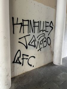 KAN7 tags (sometimes written as KANELLES or KANELLES YOUTH FIRM) are perpetrated by members (or a single member) of Kanelles, a group of supporters of Girona Football club.