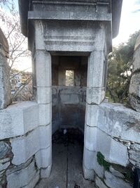 The wall has many arrowslits for archers to shoot arrows. There is an enclave that often smells of urine, as people sometimes use it as a toilet.